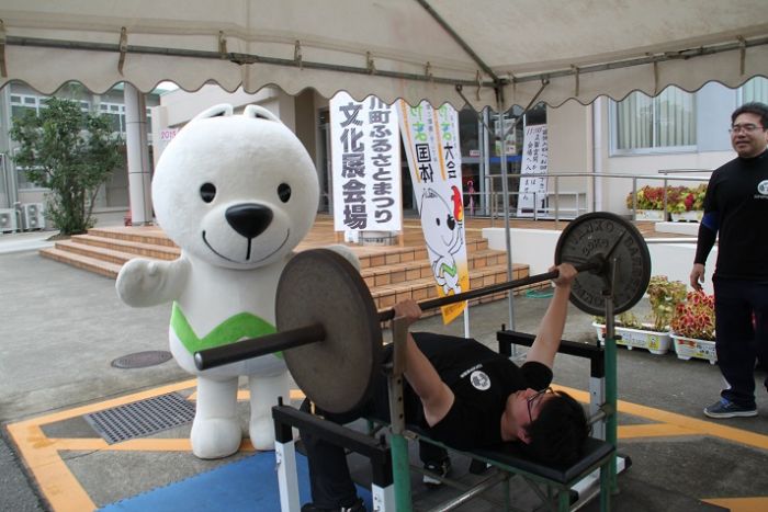 会場には、紀の国わかやま国体の公開競技であるパワーリフティングの体験コーナーがあったワン!