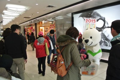 その後、物産店にあるステージで熊本県のゆるキャラ「くまモン」と一緒に、