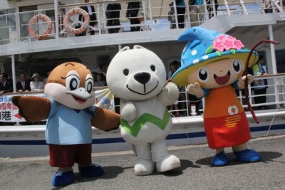 きいちゃんは、岬町ご当地キャラクター「みさっきー」、大阪府広報担当副知事「もずやん」と一緒にうずしお観光船日本丸をお出迎え☆